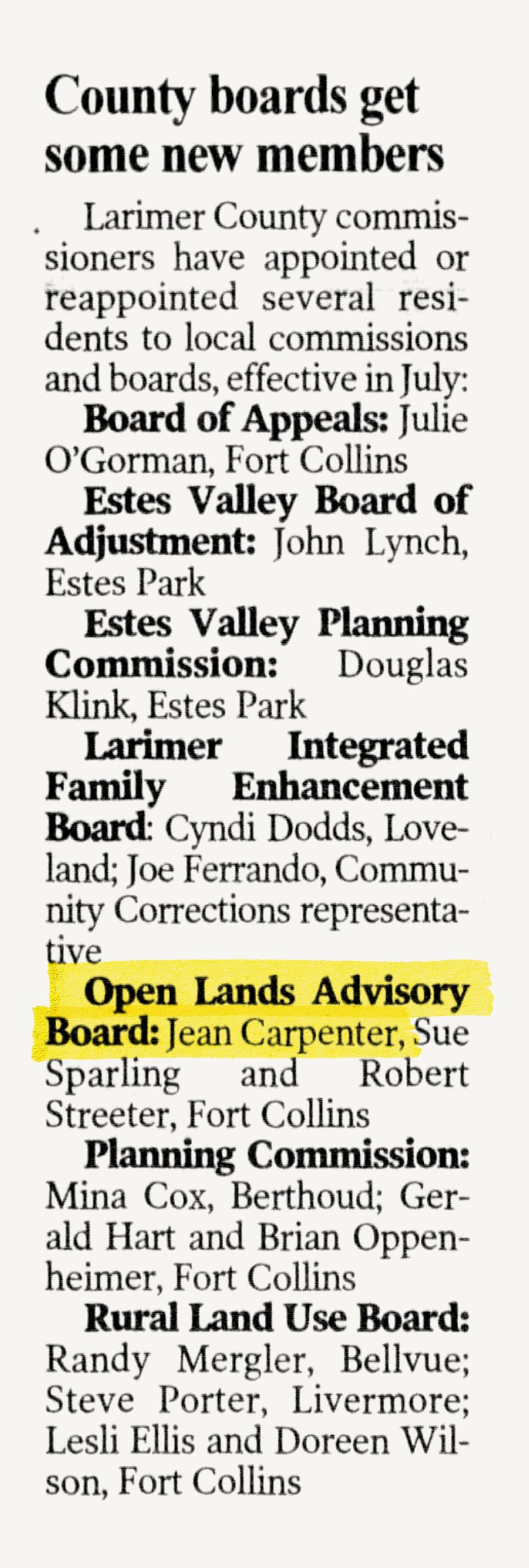 A recruiting article in early 2000 in the Fort Collins Coloradoan caught my eye requesting applicants for various county volunteer boards. A vacancy on the Larimer County Open Lands Board looked like a good fit for a long time resident and biology teacher who loved sharing the outdoors with her students.