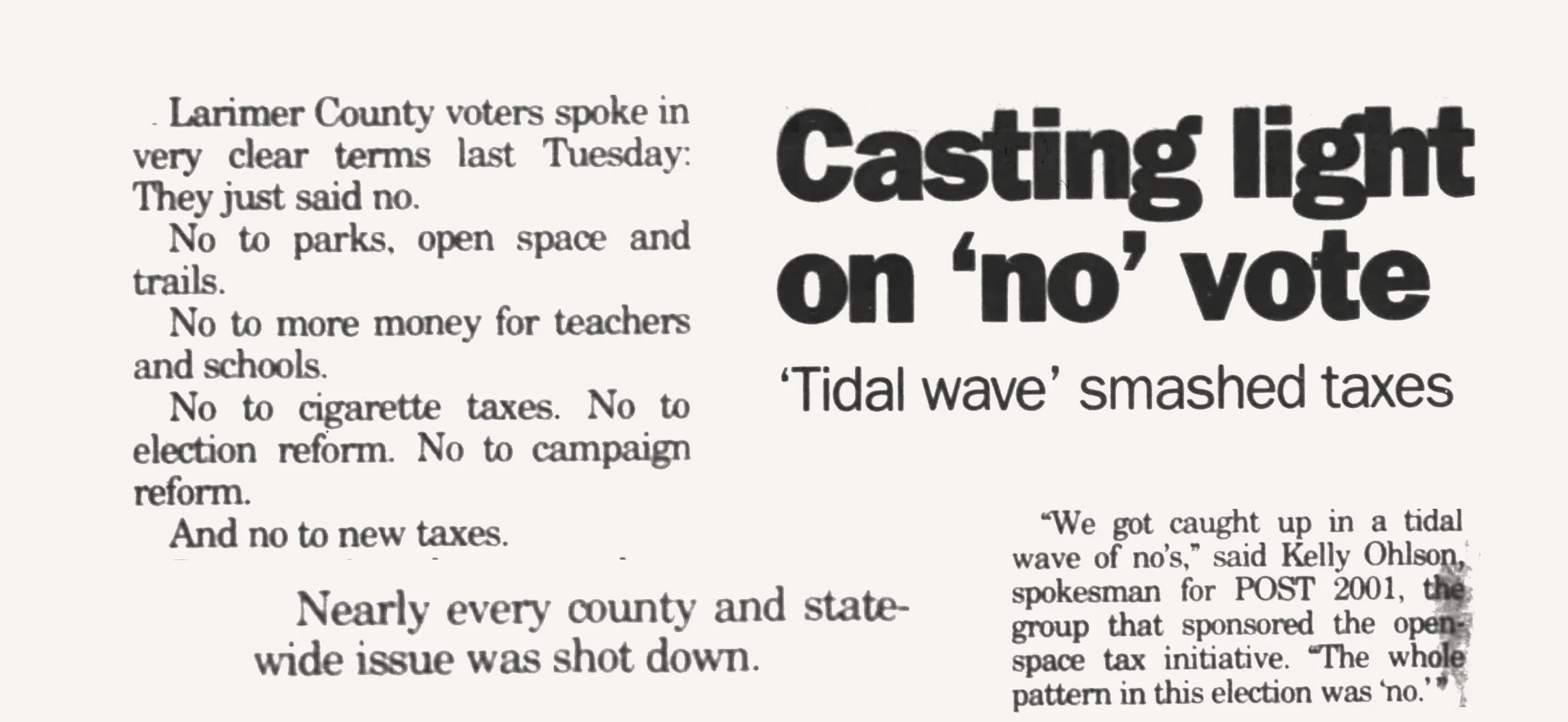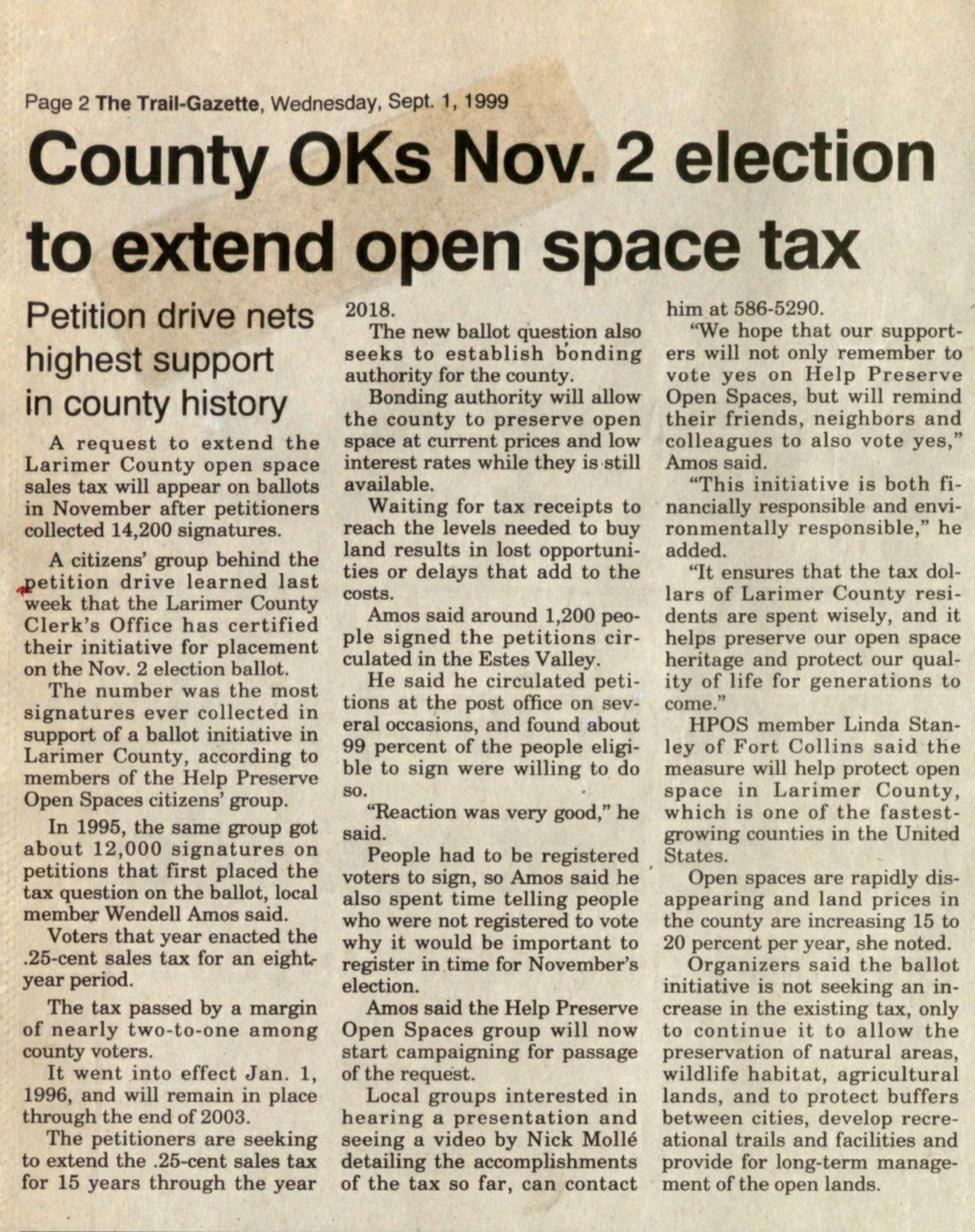 Some of us were out there every weekend gathering signatures, and if you've ever gathered signatures for an initiative, you know how difficult this can be, especially for a tax proposal. Larimer County residents at that time were conservative, and taxes usually lost at the ballot box. But we persevered and got the signatures!