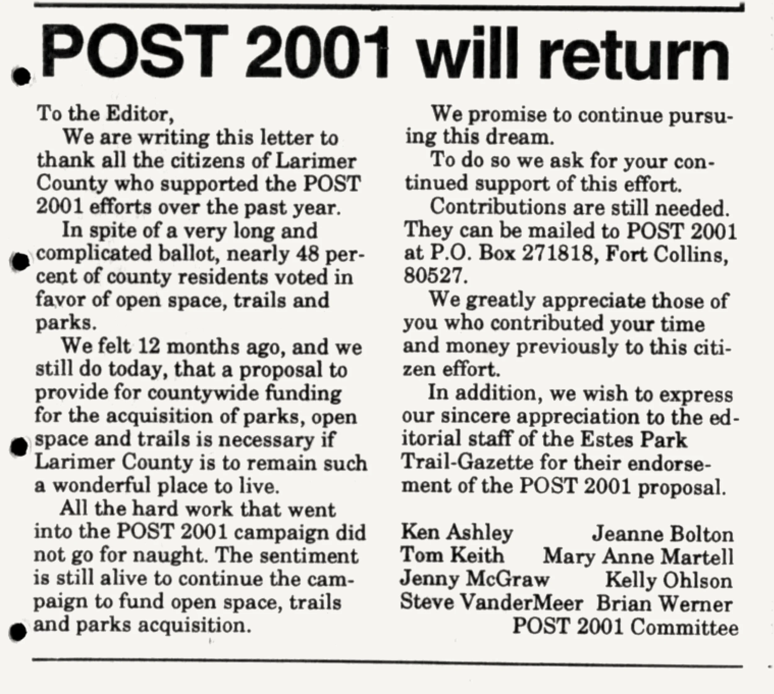 Armed with the backing of the parks master plan and a healthy dose of optimism, I worked with a group of citizens that formed in 1994 to pursue the dream of a dedicated sales tax in Larimer County. Our dream was not realized that year, but there was enough voter support to believe that a revised measure could pass.